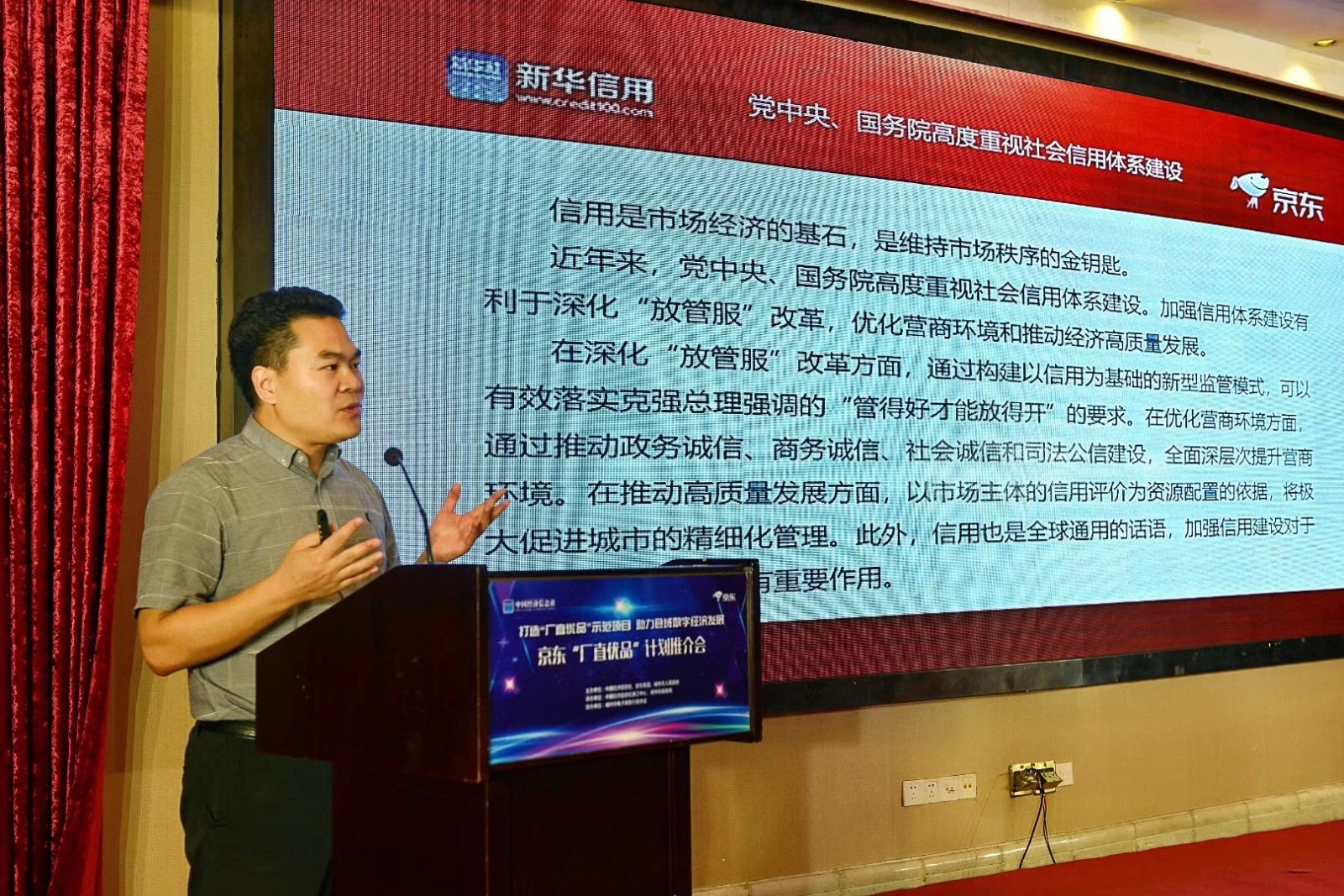 圍繞廠直優(yōu)品計劃這一推廣活動,嵊州市委常委、副市長粱瑜、中國經(jīng)濟信息社領導、中國經(jīng)濟信息社新華信用負責人、京東相關業(yè)務負責人分別發(fā)表了講話。