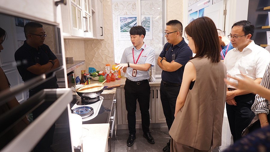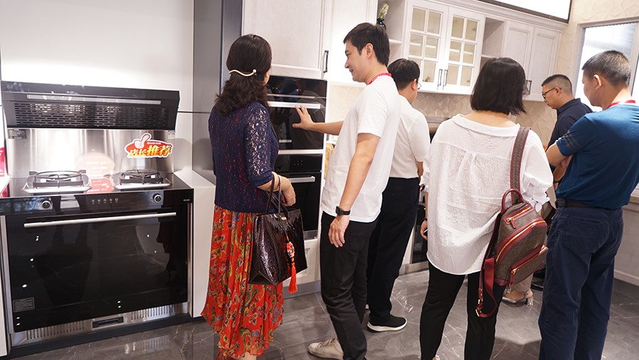 考察團一行來到佳歌集成灶展廳近距離體驗了一把佳歌集成灶的使用感受。佳歌所有產(chǎn)品均出自全球頂尖設計師之手,真正的精雕細琢,整體外觀一體成型,99.96%的凈煙能力,5.0kW超大火力都無一不讓考察團拍手稱贊。