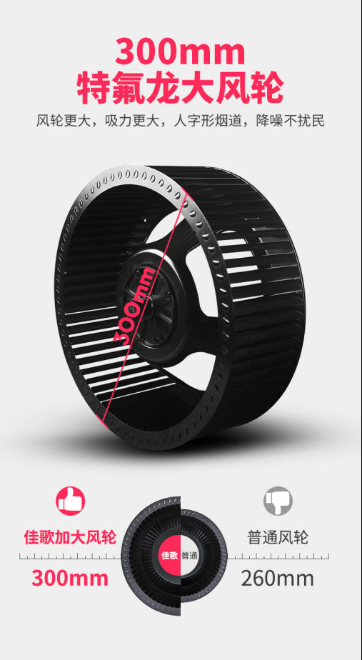 佳歌集成灶W1采用300mm超大特氟龍不沾油風(fēng)輪,吸煙量可達(dá)17m3/min以上,風(fēng)壓可達(dá)400pa,吸油煙率可達(dá)99.96%以上。